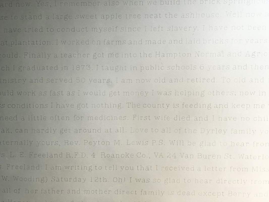 My residency aimed to support Roanoke College’s Center for Studying Structures of Race (CSSR) by drawing on the research conducted by students who developed the Genealogy of Slavery database—an open-access resource documenting the history of enslavement in Roanoke County from 1840 to 1865. Within this extensive database, I focused on Reverend Peyton M. Lewis (1849-1934), who lived in the Roanoke Valley as an enslaved child. His father and uncle, also enslaved by local builders, likely contributed to the construction of several structures on campus. In 1934, Reverend Lewis corresponded with descendants of his enslavers, and these letters are now part of the Roanoke Historical Society’s permanent collection. I also discovered additional texts written by Reverend Lewis in other archives, providing insight into his life in his own words.